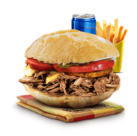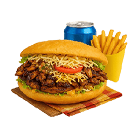 Poulet boucané, banane plantain, Emmental, salade, tomates, oignons caramélisés, sauce chien, sauce brésil.