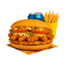 3 Tenders, Emmental, pommes de terre rösti, salade, tomates, oignons rouges, sauce chien, sauce andalouse.