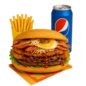 Steak, tenders, bacon, oeuf, Emmental, salade, tomates, oignons rouges, sauce chien, sauce barbecue.
