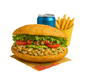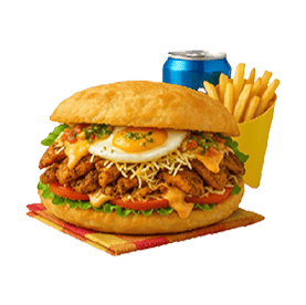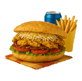 Escalope de poulet mariné, oeuf, Emmental, salade, tomates, oignons rouges, sauce chien, sauce miami.