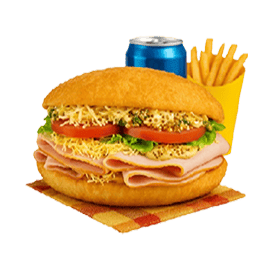 Jambon de dinde, emmental, salade, tomates, sauce chien, sauce à l'ancienne.