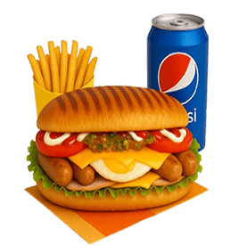 Steak haché, bacon, Emmental, sauce chien, salade, tomates, sauce barbecue.