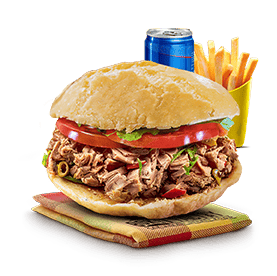 Poulet mariné au colombo (poulet couleur curry), Emmental, sauce chien, galette de pommes de terre, pikliz, salade, tomates, sauce blanche.