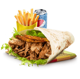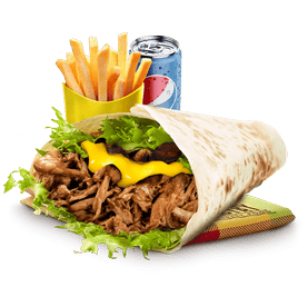 Poulet boucané, banane plantain, emmental, salade, tomates, oignons caramélisés, sauce chien, sauce brésil.